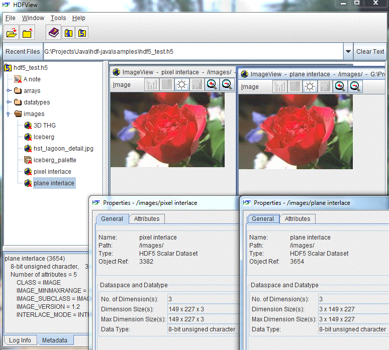 An HDF5 image is a dataset that conforms to the HDF5 Image Specification. HDFView supports two types of images: indexed and true color. Both indexed image and true color image have predefined attributes and data layout according to the HDF5 image specification. For more details about HDF5 image, see the HDF5 Image Specification.